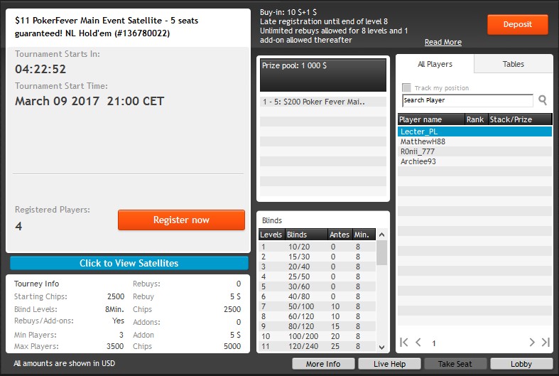- 20:00 – za to dwie godziny później rozpocznie się OSTATNI turniej online, dzięki któremu będziecie mogli dostać się do Main Eventu Poker Fever w Ołomuńcu. Będzie to MEGA satelita, w której organizator gwarantuje aż DWADZIEŚCIA wejściówek do turnieju docelowego. Wartość gwarancji równa się 4.000$! (wpisowe to tylko 11$). Jest moc!