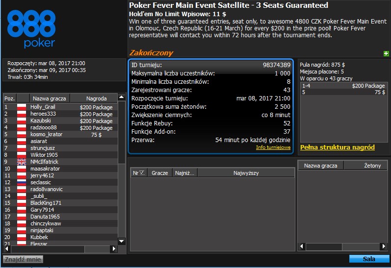 To był ostatni turniej kwalifikacyjny do ME Poker Fever w Ołomuńcu na 888poker. Od teraz przenosimy się na PartyPoker, gdzie do rozegrania pozostały już tylko dwie eliminacje.