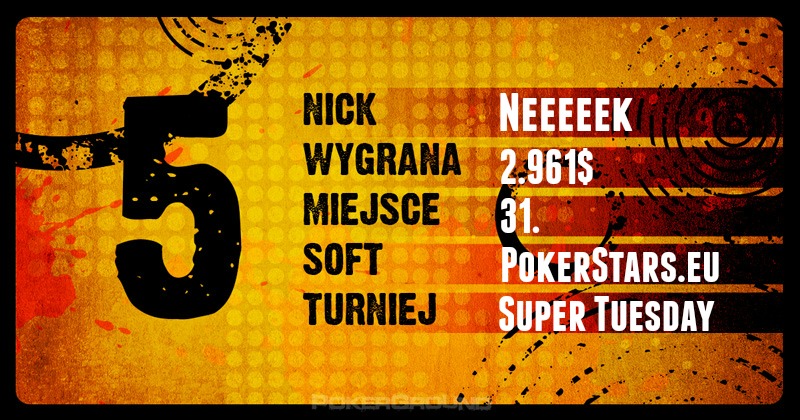 Jakże diametralnie różnią się wczorajsze i dzisiejsze zestawienie! Niniejsza „Szybka Piątka” zawiera niemal wszystko to, co chcielibyśmy oglądać codziennie – duże wygrane, znane nicki, ciekawe turnieje. Brakuje różnorodności platform, ale trzeba pamiętać, że Poker Stars jest wciąż bezkonkurencyjny jeśli chodzi o pule turniejowe.