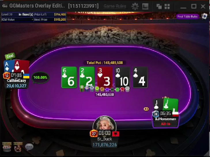 Na finałowym stole mieliśmy jednego Polaka. BJHorseman świetnie sobie radził i zatrzymał się dopiero na trzecim miejscu. W ostatnim rozdaniu nasz gracz znalazł się w sytuacji bez wyjścia. Polak miał parę JJ, a Ukrainiec CallMeEasy parę AA. Doszło do szybkiego zwarcia przed flopem i showdownu. Spadł board: 623T4 i nasz gracz musiał wstać od stołu. Na pocieszenie czekała na niego sowita wypłata, aż 193.200$.