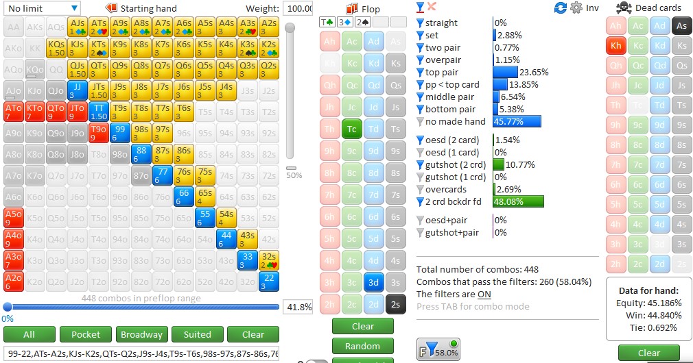 Flopzilla pokazuje, że na ten szeroki range, nadal mamy ponad 40% equity, co sprawia, że grając c-bet, nie boimy się przebicia, bo i tak będziemy mogli z czystym sumieniem zobaczyć kolejną kartę, o ile nie będzie to zagranie all-in. Pamiętajcie, że w pokerze, inaczej niż w życiu, nie potrzebujemy 50% equity (szans na wygraną) do tego, żeby zakład był dochodowy. Czasem może być tych procentów znacznie, znacznie mniej – ważne jest to, ile pieniędzy znajduje się w puli, i ile kosztować będzie nas sprawdzenie.