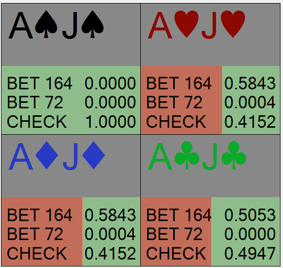 Najgłębszym poziomem, na którym różnicujemy swoje zagrania, jest poziom kombinacji w danym układzie. Np. jeśli posiadamy AJs, możemy rozgrywać je w całkowicie różny sposób. Jak widzicie, dla trzech z czterech kombinacji solver proponuje miksowanie pomiędzy czekaniem i betowaniem. Dla kombinacji w pikach jest to w 100% check.