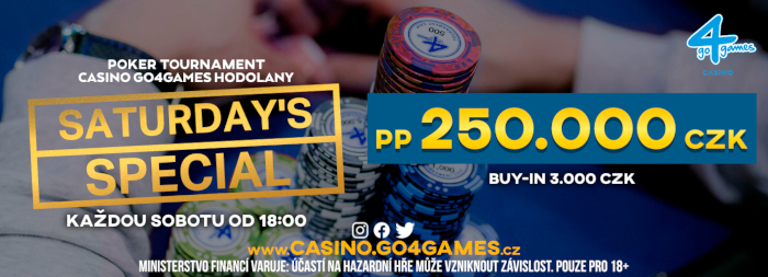 Sobotni wieczór Go4Games Casino Hodolany należy do eventu Saturday Special, z pulą 250.000 CZK i wpisowym w wysokości 3.000 CZK.