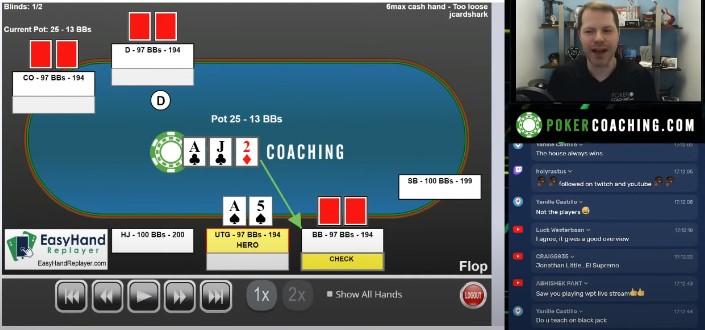 W rozważanym przykładzie znaleźliśmy się w roli agresora z A5s na flopie AJ2 w wieloosobowej puli. Już od flopa możemy rozważyć czekanie, ale c-bet też jest dobry, ponieważ nasi rywale nie muszą mieć asa, a nasz bet będzie chronił układ, który obecnie posiadamy.