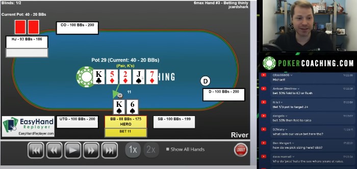 W powyższym przykładzie broniliśmy blinda. Na flopie rywal zagrał c-bet, a my call. Turn został przeczekany z obu stron. Zgodnie z tym, co rekomenduje trener, powinniśmy zagrać value bet niskim sizingiem. Nasz rywal może sprawdzić nas z QQ, z wieloma waletami, może to również zrobić z TT lub też np. z A7 czy A5. Gdy jednak zostalibyśmy przebici, to na tych stawkach, mając na uwadze tendencje graczy, o których wspominaliśmy na wstępie tego podpunktu, powinniśmy zagrać fold. Dlaczego? Bo jeśli podzielimy pulę graczy na tych, którzy blefują więcej niż powinni i mniej niż powinni, to na tych limitach przeważa ta druga grupa.