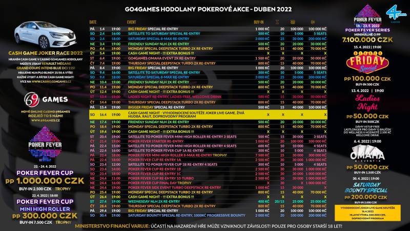 Ołomunieckie kasyno Go4Games Hodolany ma dla Was specjalną ofertę na kwiecień. Zapoznajcie się z najważniejszymi wydarzeniami pokerowymi oraz z bieżącymi promocjami.