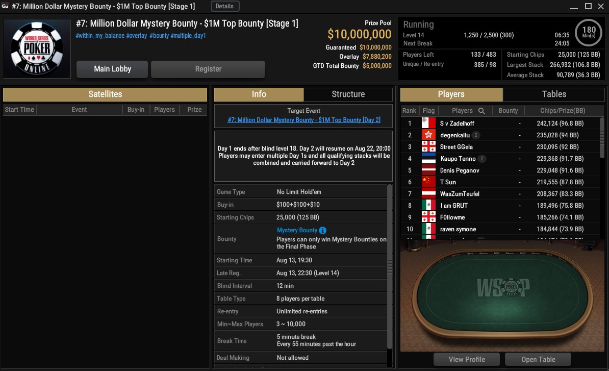 Codziennie rozgrywane są dni pierwsze tego turnieju. Dzień drugi, w którym do zdobycia będzie bounty, zaplanowano na 22 sierpnia. UWAGA: Gracze mogą wziąć udział w dowolnej liczbie dni pierwszych. Do drugiego dnia zostanie przeniesiony każdy stack, z którym gracz wywalczy awans do fazy finałowej (dzień 2.).