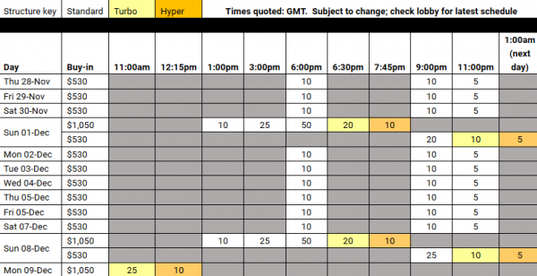 1 i 8 grudnia odbędą się Mega Satelity za 1.050$, w których do wygrania będzie aż 50 biletów – każdy o wartości 10.300$. Początek o godz. 18:00. Gwarancja operatora wynosi łącznie aż 1.000.000$.