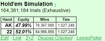Odrobinę gorzej wygląda nasza sytuacja, gdy sprawdzamy z parą 22, ale zapewniam Was, że gdybyśmy mieli tylko taki kaprys, i znalazłby się taki chętny, to moglibyśmy do końca życia, przez 24 godziny na dobę, grać call i tylko dzięki temu zagraniu stalibyśmy się bardzo bogatymi ludźmi.
