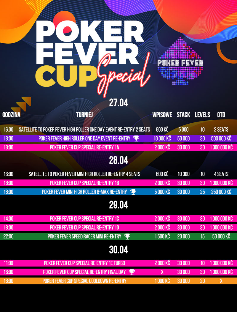 Poker Fever Special to wydarzenie, które odbędzie się w dniach od 27 do 30 kwietnia. To 4-dniowy okołoweekendowy festiwal z gwarantowaną pulą nagród wynoszącą 1.800.000 CZK.