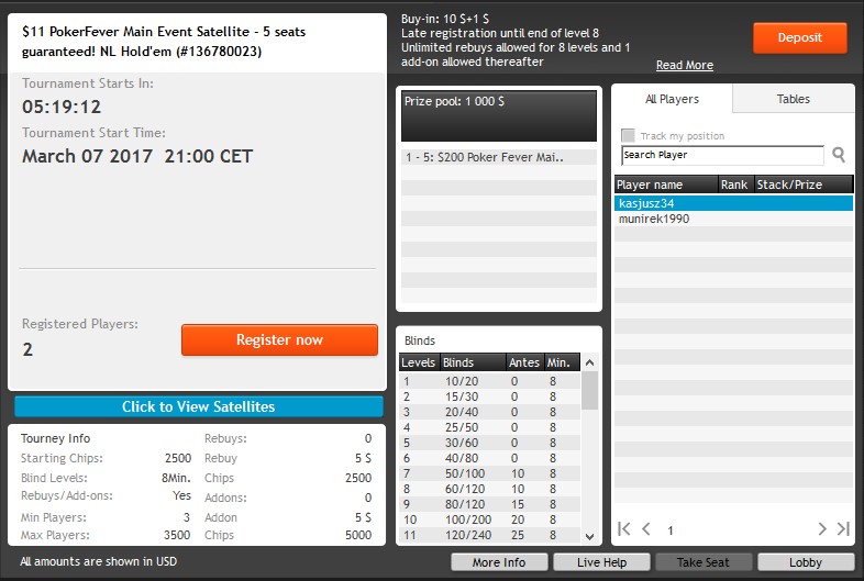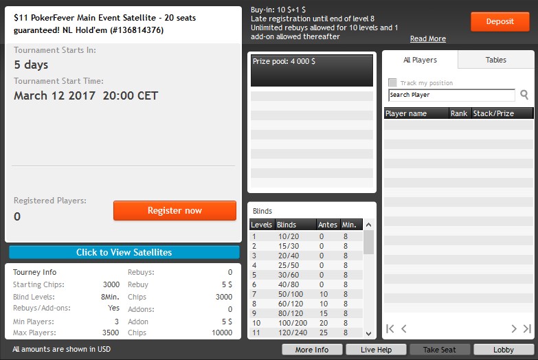 Aby wziąć udział w OSTATNIEJ satelicie do Poker Fever na 888poker, musicie posiadać konto u tego operatora. Rejestrując je przez PokerGround (z tego linku), możecie liczyć na wiele korzyści, wśród których można wymienić, m.in.: darmowe 88$, bonus 100% do 400$ oraz 10 biletów turniejowych.