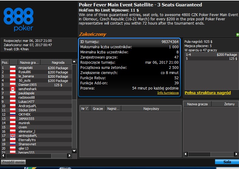 Wczoraj odbyła się przedostatnia satelita na Ósemkach. Udział wzięło w niej 47 osób. Na czterech najlepszych graczy czekały wejściówki, a zawodnik, który finiszował na piątej pozycji, otrzymał 125$.