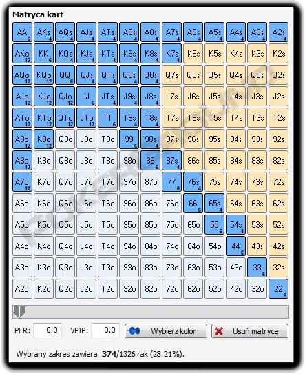 W porównaniu do swoich poprzedników o tej pozycji możemy powiedzieć, że jest pierwszą, z której regularnie dopuszczamy się kradzieży blindów. Żeby była jasność: to oczywiste, że gdy podniesiemy premium hand na tej pozycji, naszemu otwarciu będzie przyświecała chęć zyskania na wartości, jednak w obliczu rozszerzonego zakresu otwarć, znajdzie się w nim wiele układów, które traktujemy w kategorii semi-blefu. Co to oznacza? Oznacza to tyle, że do naszego opening range’u dołożymy układy, na których zarabiać będziemy od razu, gdy gracze z blindów wyrzucą karty. Jeśli tak się nie stanie, nasze układy będą miały na tyle grywalności i equity, a my też najczęściej będziemy mieli pozycję, że będziemy w stanie prowadzić dochodową grę po flopie.