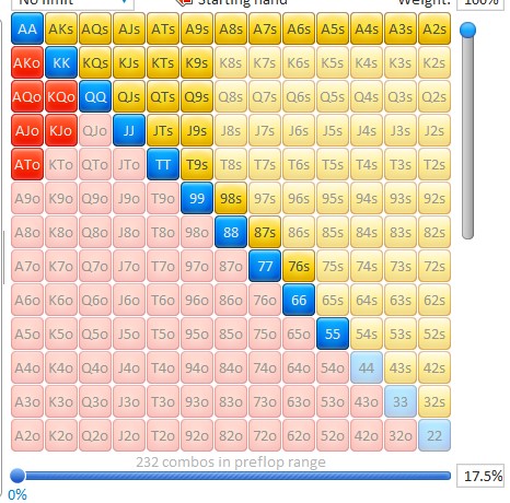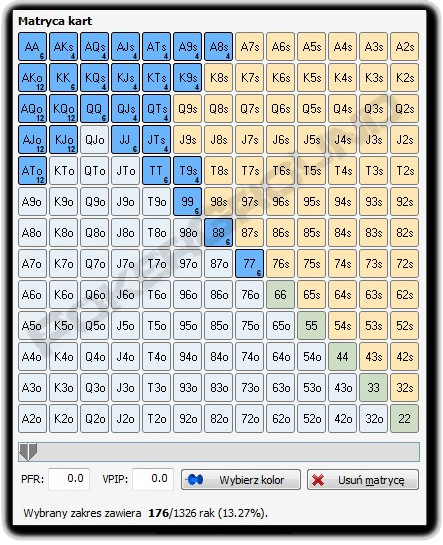 Jak widzicie, nasz trener rekomenduje otwieranie ok. 13% układów z tej pozycji. Na ten zakres składają się wysokie i średnie pary i wysokie, głównie suited, brodway’e i kilka słabszych układów (A8s, K9s), które po flopie często trafią top parę ze średnim kickerem, ale również drawy i backdoor drawy do wysokich kolorów, co sprawi, że częściej będzie można grać z tymi układami w sposób aktywny.