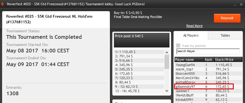 Powerfest to seria na każdą kieszeń. Każdy może znaleźć się w naszym codziennym zestawieniu, gdy wpisowe do turnieju wynosi zaledwie 5.50$. Ta sztuka udała się dzisiaj graczowi o nicku „gibonnsky97„, który zaliczył wizytę na stole finałowym eventu #25. Polak za zdobycie 6 miejsca został wynagrodzony kwotą w wysokości 172,65$.