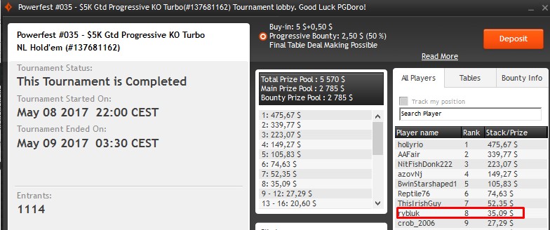 Relatywnie niewielkie pieniądze za ósme miejsce w evencie #35 zgarnął „rybluk_„. Wygrana 35,09$ i 10,22$ bounty z pewnością nikogo nie zachwyci, ale cieszy obecność Polaka na finałowym stole.