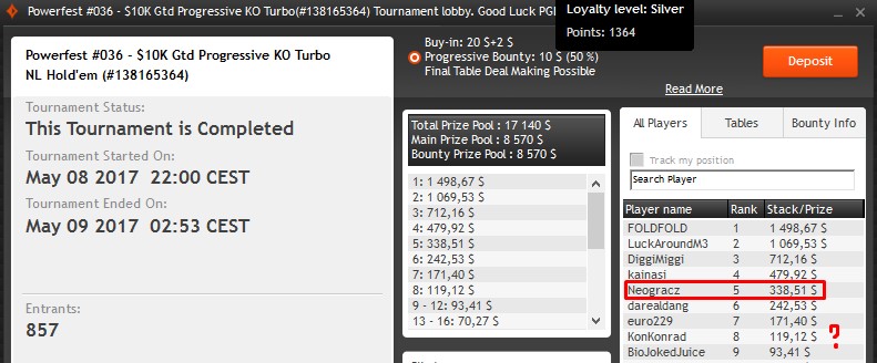 W kolejnym evencie Powerfest na FT znalazł się „Neogracz„. Polak skończył udział w turnieju na piątym miejscu, za co otrzymał 338,51$. Na ósmej pozycji uplasował się „KonKonrad” – niestety nie jesteśmy pewni, czy jest On reprezentantem Polski. Może Wy możecie potwierdzić lub zdementować tę informację*?