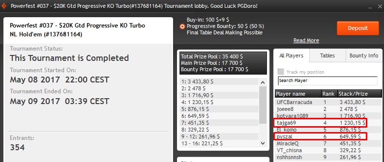 Znacznie bardziej okazałe kwoty zainkasowało dwóch Polaków, którzy znaleźli się na stole finałowym eventu #37. „pyszal” zakończył udział w turnieju na szóstym miejscu i zarobił 649,59$, a „tajga69” uplasował się tuż za podium i w nagrodę za swoją świetną grę otrzymał 1230,15$.