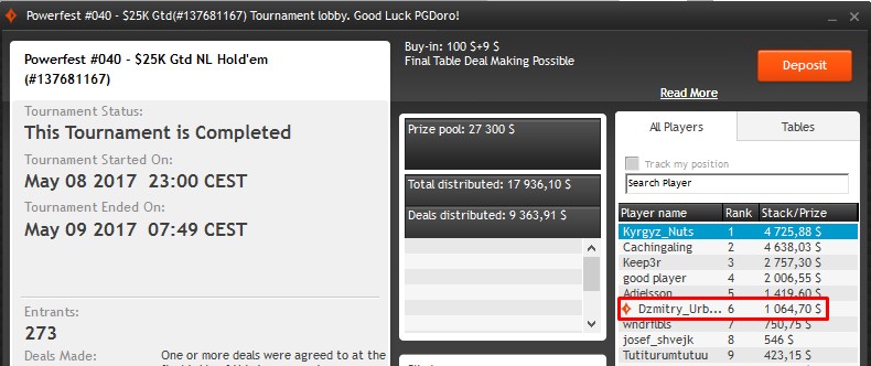 Kolejny wspaniały występ zaliczył Dzmitry Urbanovich. Jeszcze tym razem obyło się bez shipa, ale warto podkreślić fakt, że drugi dzień z rzędu Polak zalicza występ na stole finałowym turnieju z serii Powerfest. Tym razem Dima uplasował się na szóstym miejscu eventu # 40 i zgarnął 1.064,70$.
