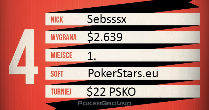 Warto podkreślić bardzo dobrą formę gracza o nicku Sebsssx. Przedwczoraj dwa finałowe stoły w turniejach Big, w tym jedno zwycięstwo, a wczoraj triumf w $22 PSKO, co ponownie pozwoliło znaleźć mu się w naszym zestawieniu.