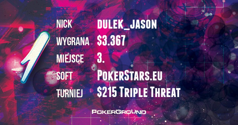 Na czele zestawienia melduje się niezawodny dulek_jason. Weteran zmagań on-line dotarł do finałowej rozgrywki nowego turnieju $215 Triple Threat. Jego struktura – 3max, PSKO, ZOOM – jest bardzo wymagająca, jednak dulek udowodnił, że żaden format mu niestraszny i za zajęcie trzeciego miejsca zgarnął $3.367.