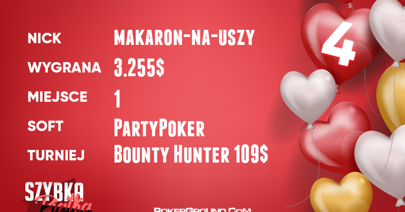 Wyróżnić chcemy też dzisiaj gracza o nicku makaron-na-uszy, który na PartyPoker zgarnął wszystkie żetony w w turnieju 109$ Bounty Hunter. Wygrana dała mu przychód w wysokości 3.255$.