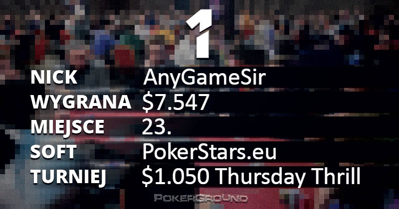 Najlepszy rezultat pochodzi z rozgrywki $1.050 Thursday Thrill, wynosi $7.547 i należy do gracza o nicku AnyGameSir. Co prawda, zakończył on turniej na dwudziestej trzeciej pozycji, ale spora ilość bounty pozwoliła uzbierać tak okazałą kwotę.
