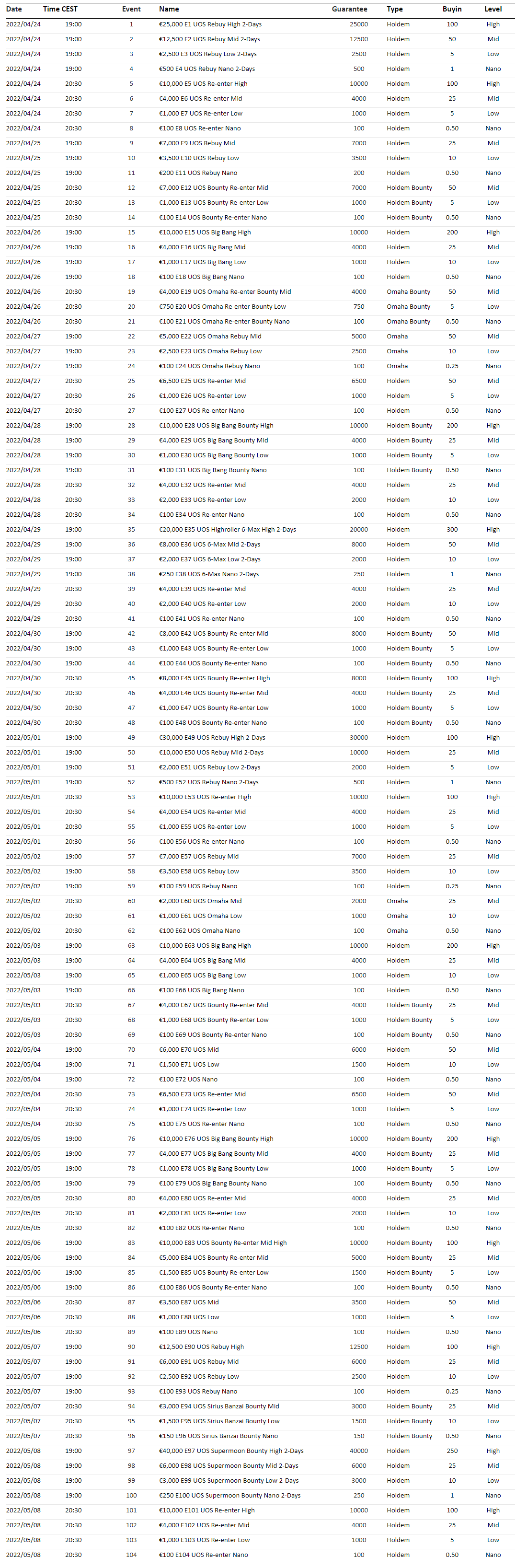W ofercie przeważają eventy w odmianie Hold’em, ale miłośnicy Omahy też znajdą kilka eventów przeznaczonych dla siebie. W obu odmianach dostępne będą również turnieje z bounty.