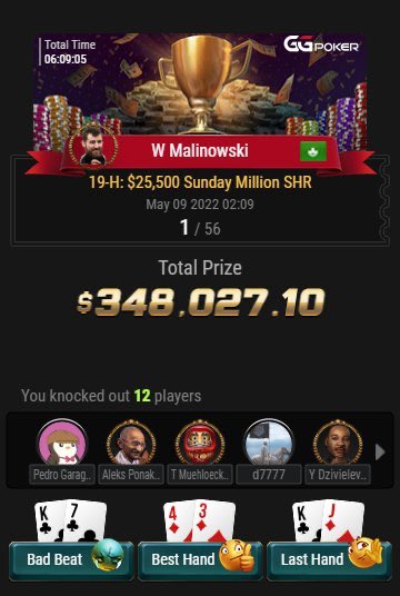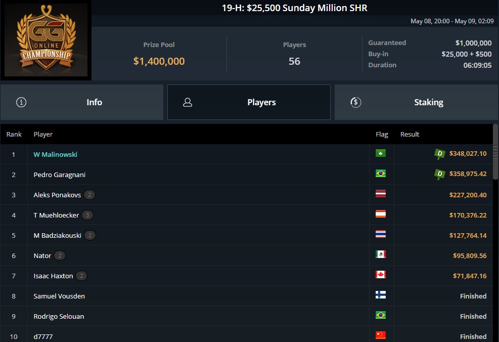 Wiktor Malinowski wygrywa event 19-H GG Online Championship 25.500$ Sunday Million SHR i zgarnia 348.027$.