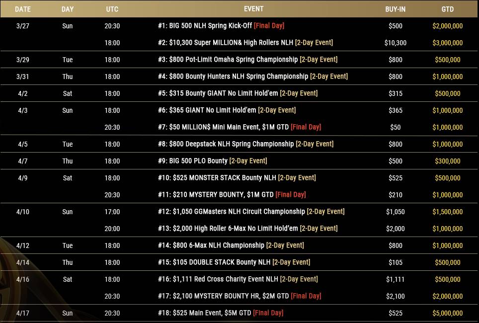 Już teraz organizatorzy imprezy zdradzili, że tego typu festiwal online będzie rozgrywany cztery razy w roku. Pierwsza jest edycja wiosenna, a kolejne trzy pojawią się w ofercie GGPoker w pozostałych porach roku.