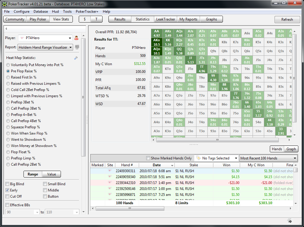 Potem to już klasyka: szybki rzut oka na podstawowe statystyki (VPIP, PFR, 3-Bet, beczki na każdej ulicy, WSD) i przegląd największych rozdań. Niestety zbadanie tylko tych dużych nie mówi wszystkiego na temat tego, w jaki sposób zachowywaliśmy się w trakcie sesji, dlatego też zagłębiam się w statystyki dla każdej pozycji (często korzystam z matrycy, na której widzę, z jakimi układami grałem, a przy tym wygrywałem i przegrywałem rozdania). W ten sposób trafiam też na te mniej spektakularne rozdania, w których mogłem popełnić błędy, a które wcześniej się nie pojawiły.